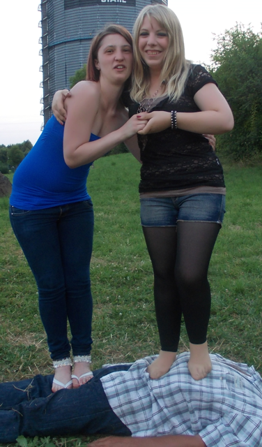 Haben Sie schon einmal gesehn wie ein Mann auf dem Boden liegt, während fast zwei Dutzend Frauen barfuß, oder mit x-beliebigem Schuhwerk (auch High Heels) seinen Körper besteigen einschließlich Arme, Oberschenkel und Gesicht?